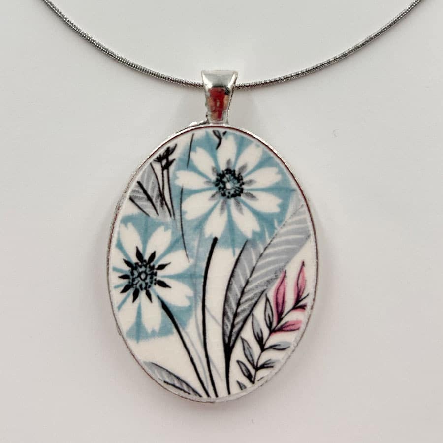 Each piece is handcrafted from recycled vintage china, carefully cut, shaped, and set into a hypoallergenic stainless steel bezel. The vintage china in your piece can be up to 100 years old, and needs to be treated gently. To keep your jewellery in top condition, handle it with care.